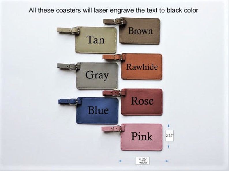 Personalized Mr. and Mrs. Luggage Tags | Lifetime Creations Includes two (2) laser engraved luggage tags, one Mr. and one Mrs. Engraving will not peel or rub off over time. Durable vegan leather material. Light brown, dark brown and gray luggage tags engrave black; black luggage tag engraves silver. Each tag measures 4.25"W x 2.75"H. By default, Mr. & Mrs. are engraved on the dark brown and light brown ...