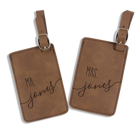 Personalized Mr & Mrs Luggage Tags Pair - Vegan Leather Wedding Luggage ... Personalized Mr. & Mrs. Luggage Tags by Lifetime Creations. Personalized Mr. and Mrs. luggage tags make a great personalized wedding gift for the bride and groom. These luggage tags are ideal for newlyweds embarking on their honeymoon or for a couple celebrating a significant anniversary. A removable identification card makes the bag tags ...